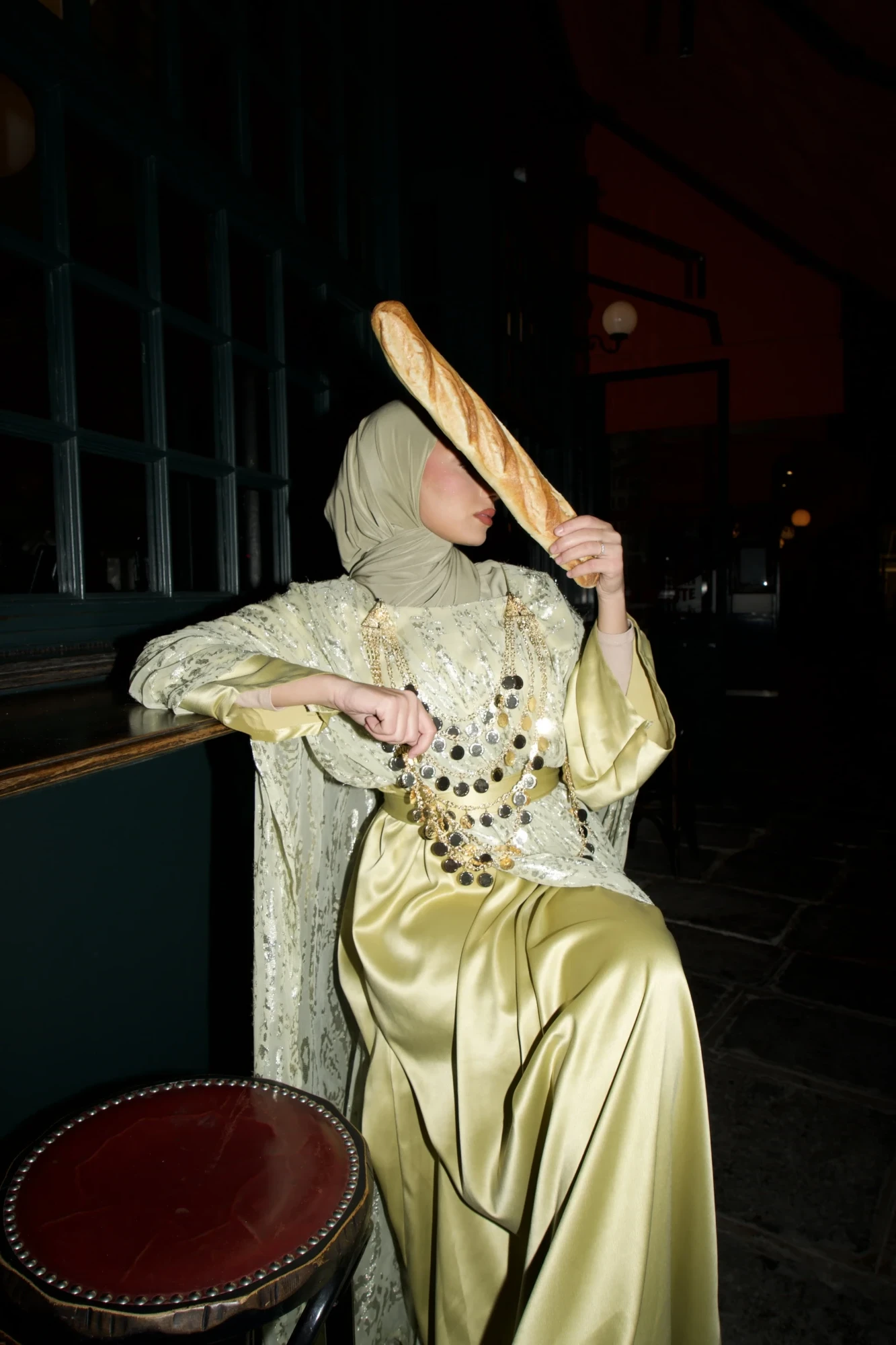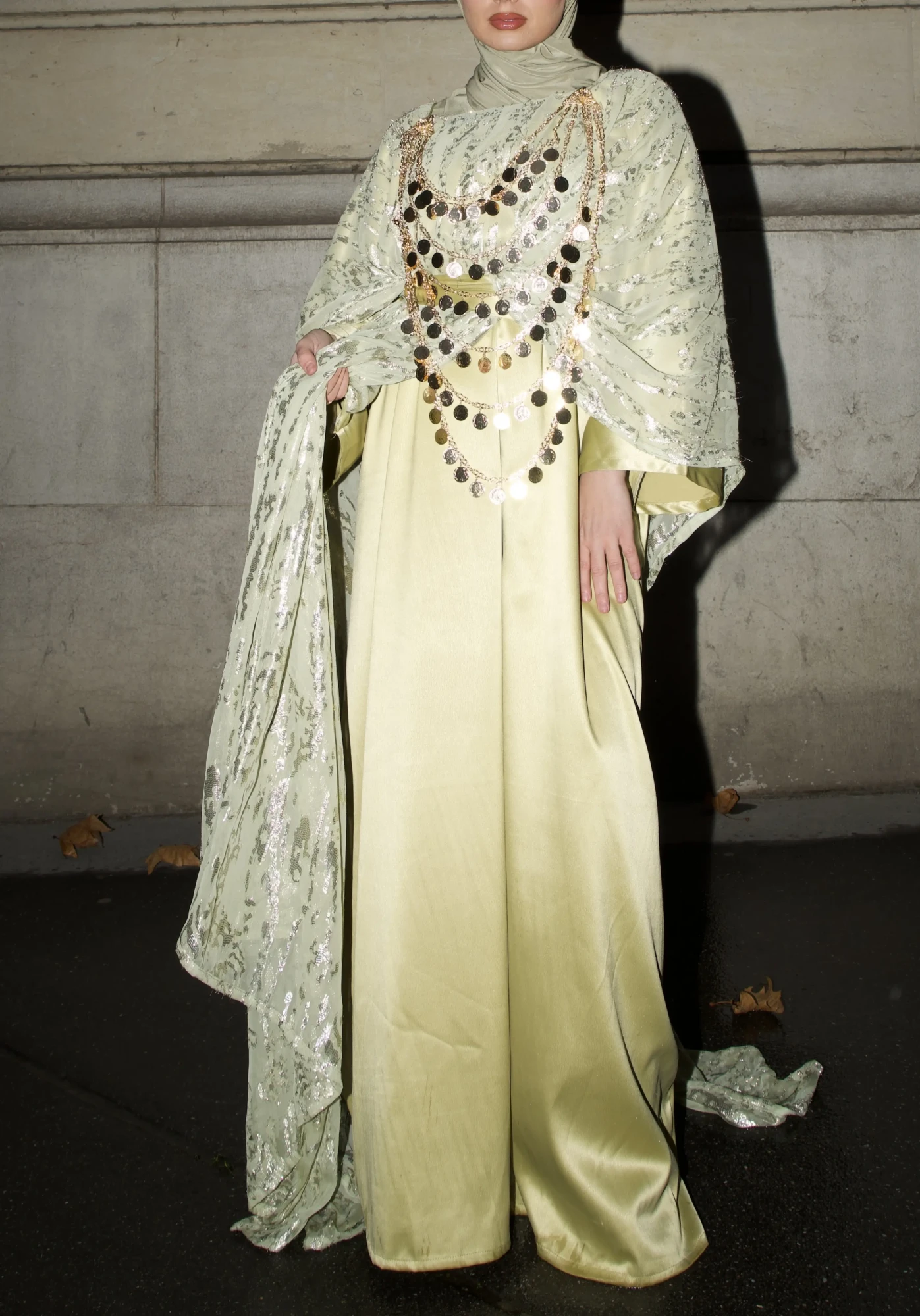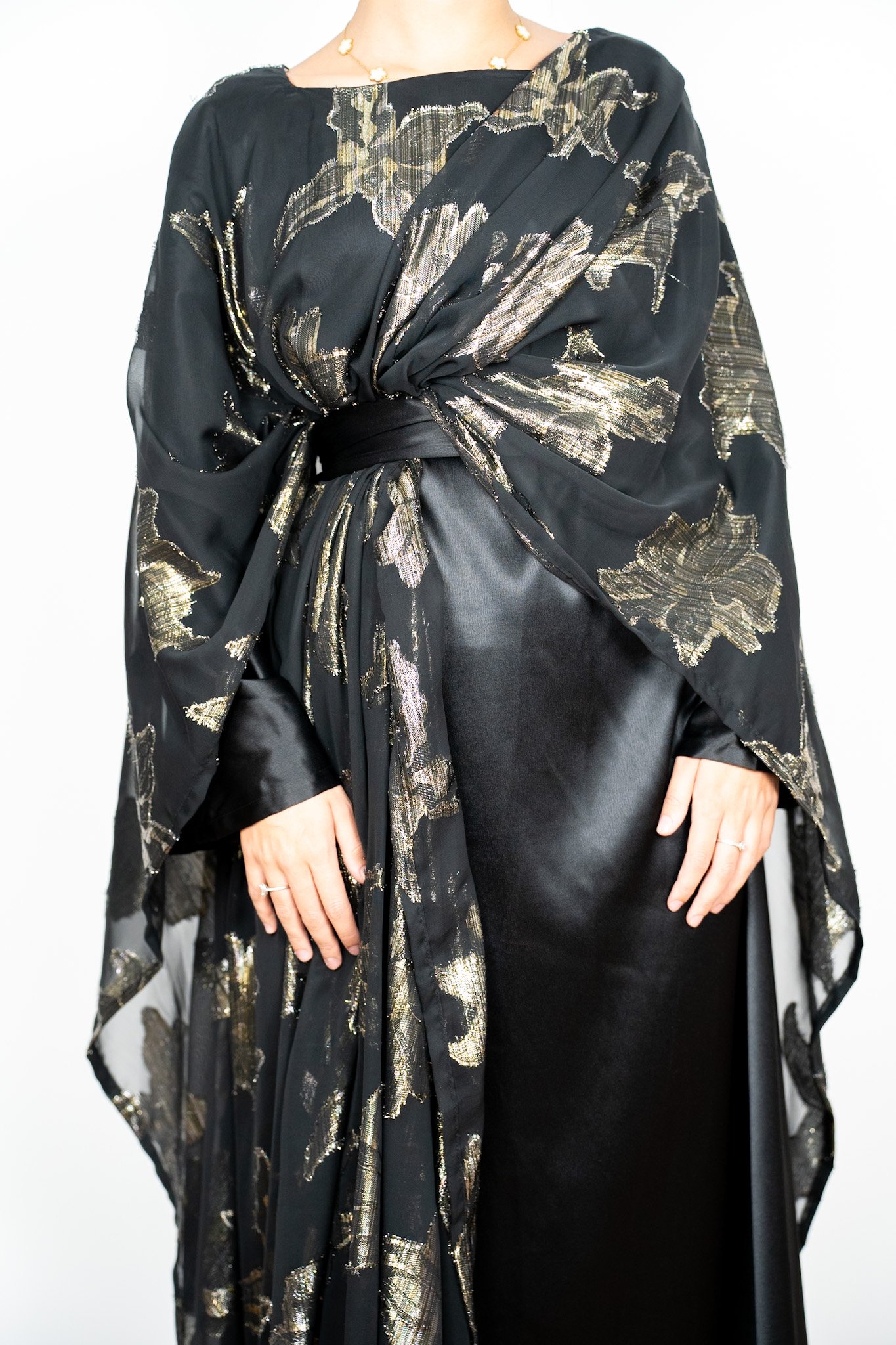 Elle se compose d’une sous-robe à manches longues en satin doux, surmontée d’un drapé en tissu noble, orné de motifs dorés délicats. Le drapé peut se nouer avec finesse à la taille.